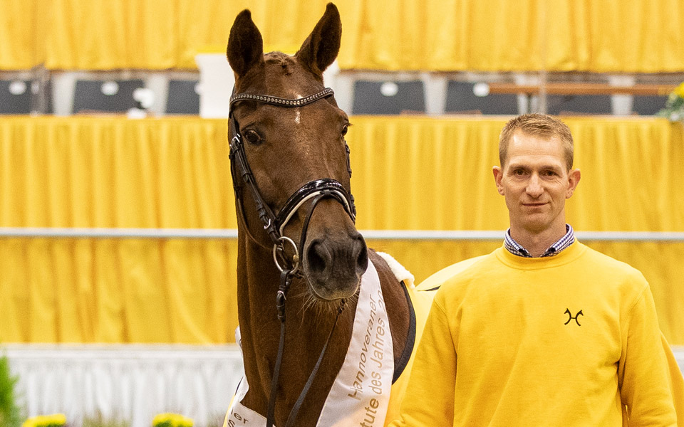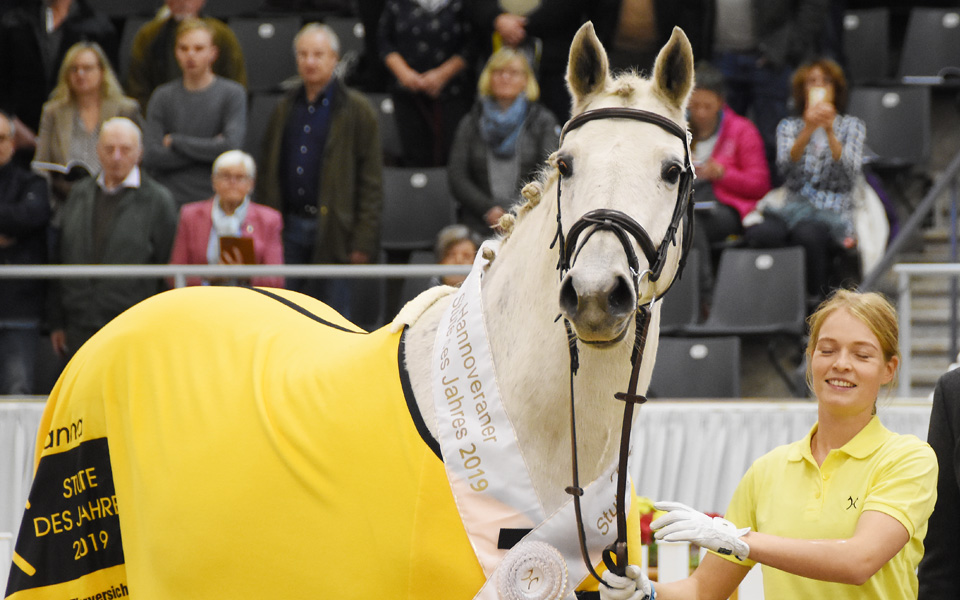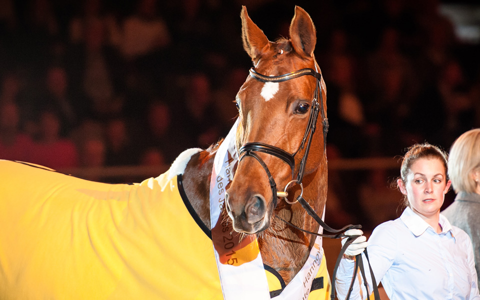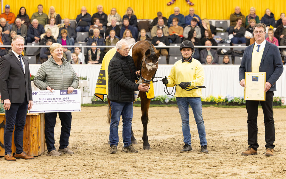 Hanoverian Mare of the Year is Dorina by Drosselklang II/Grannus. Her daughter Fine Lady is with Canada‘s Eric Lamaze one of the best show jumpers in the world. Her breeder Wilhelm Leymann from Bassum was honoured in the sold out Niedersachsenhalle.
